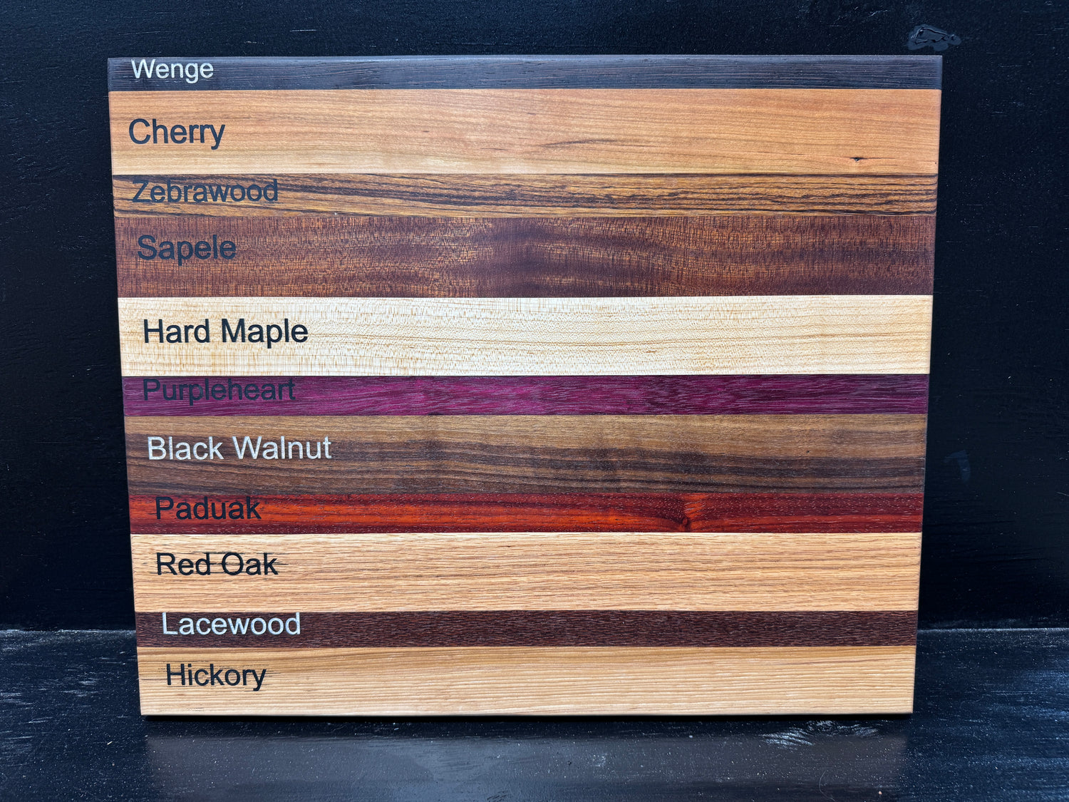 From the dark richness of Wenge and Black Walnut to the bold character of Padauk and Purpleheart, our materials are as unique as the pieces we craft. Discover the warm tones of Cherry, Sapele, and Red Oak, the striking patterns of Zebrawood and Lacewood, and the light elegance of Hard Maple and Hickory — each chosen for beauty, durability, and lasting impression.